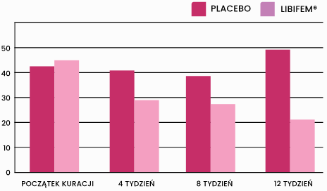 Wykres pokazuje skuteczność Libifem® w zakresie redukcji uderzeń gorąca i nocnych potów (całkowita liczba w okresie 7-dniowym). Wyraźna poprawa zauważalna jest już po 4 tygodniach.